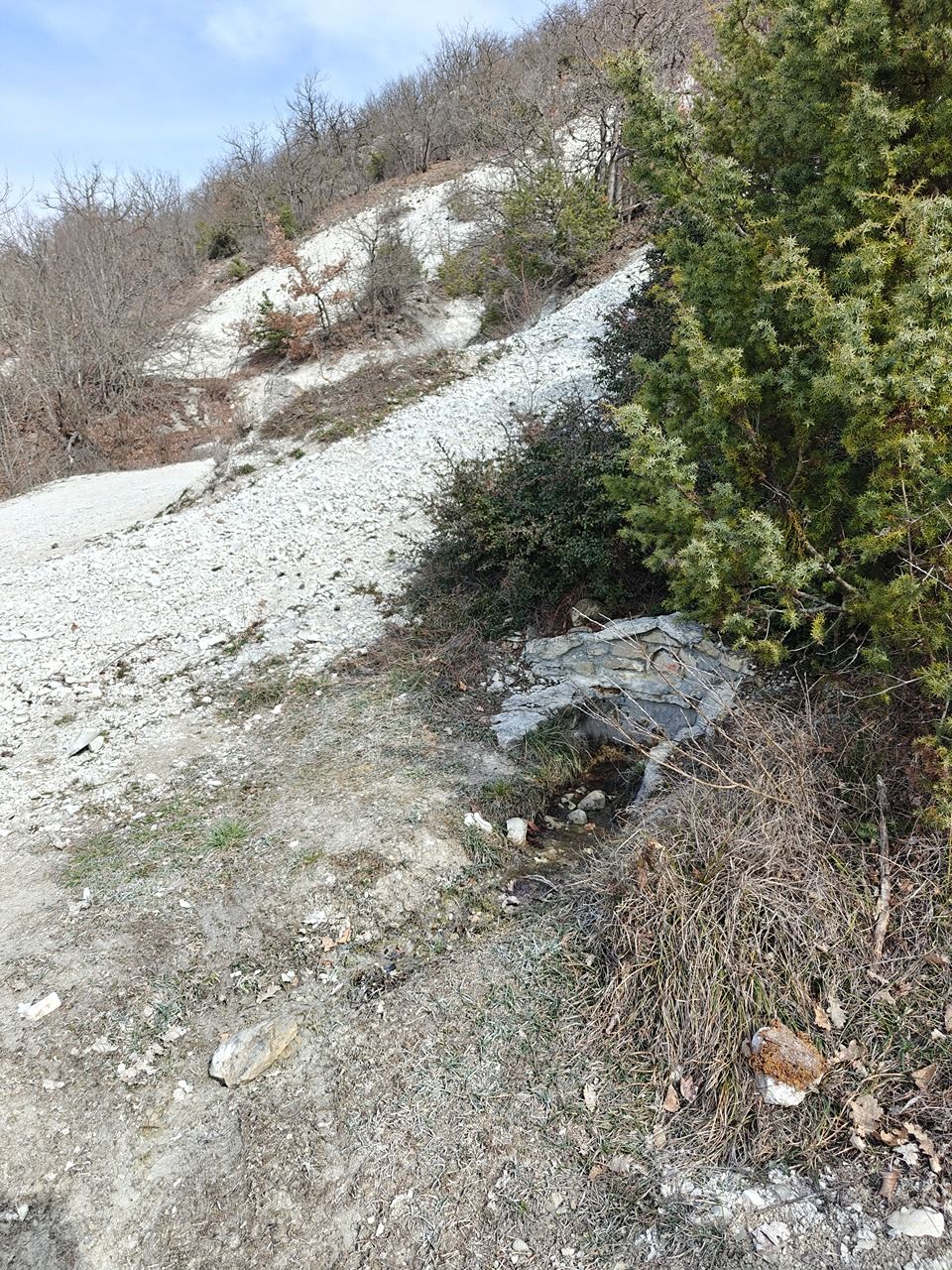 Источник бьет из-под земли. Поток очень слабый. Глубина всего пару сантиметров. Вода х...