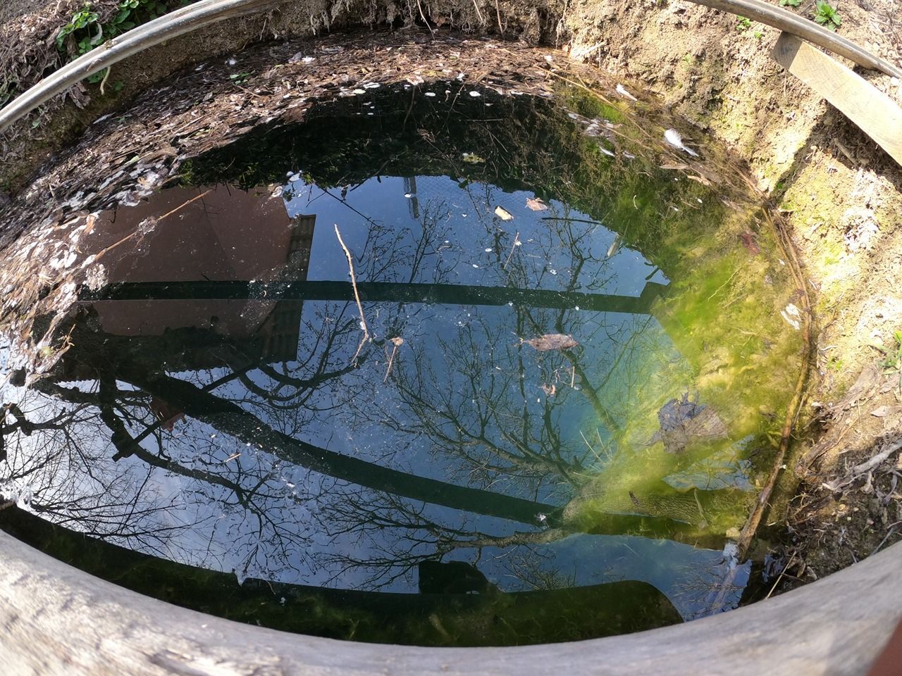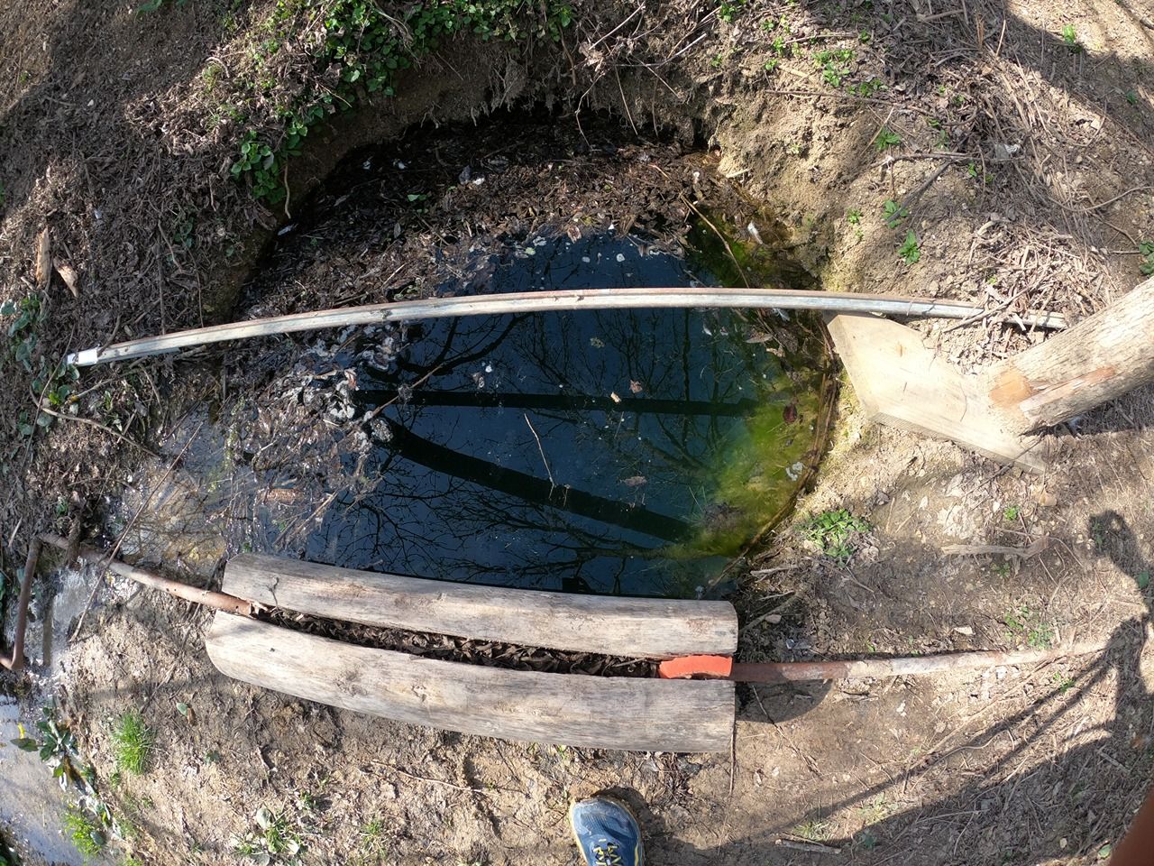 Источник расположен прямо перед забором, за которым держат птиц и скот. Вода хоть и прозрачная, но там много растительности и рядом летают насекомые. Возможно, летом в воде будет много личинок