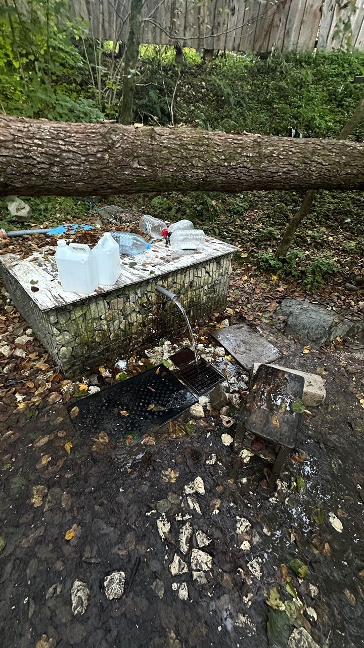 Удобный родник с трубой и сильным потоком. Сюда приезжают на машинах с канистрами.