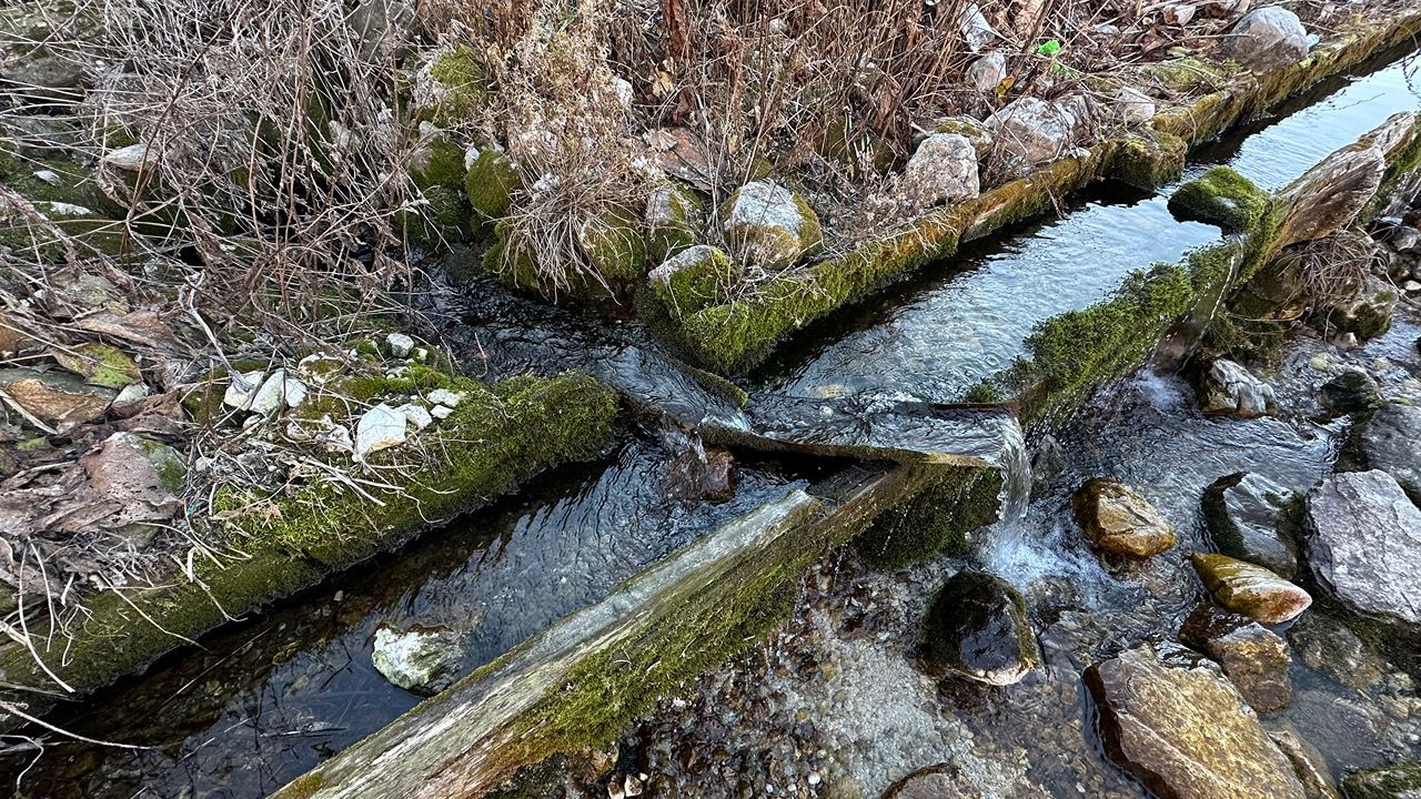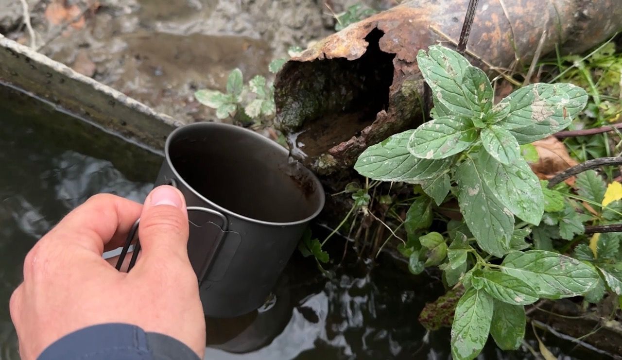 Ручей начинается в овраге. Удобно бутылкой не набрать, нужна кружка, маленький поток.