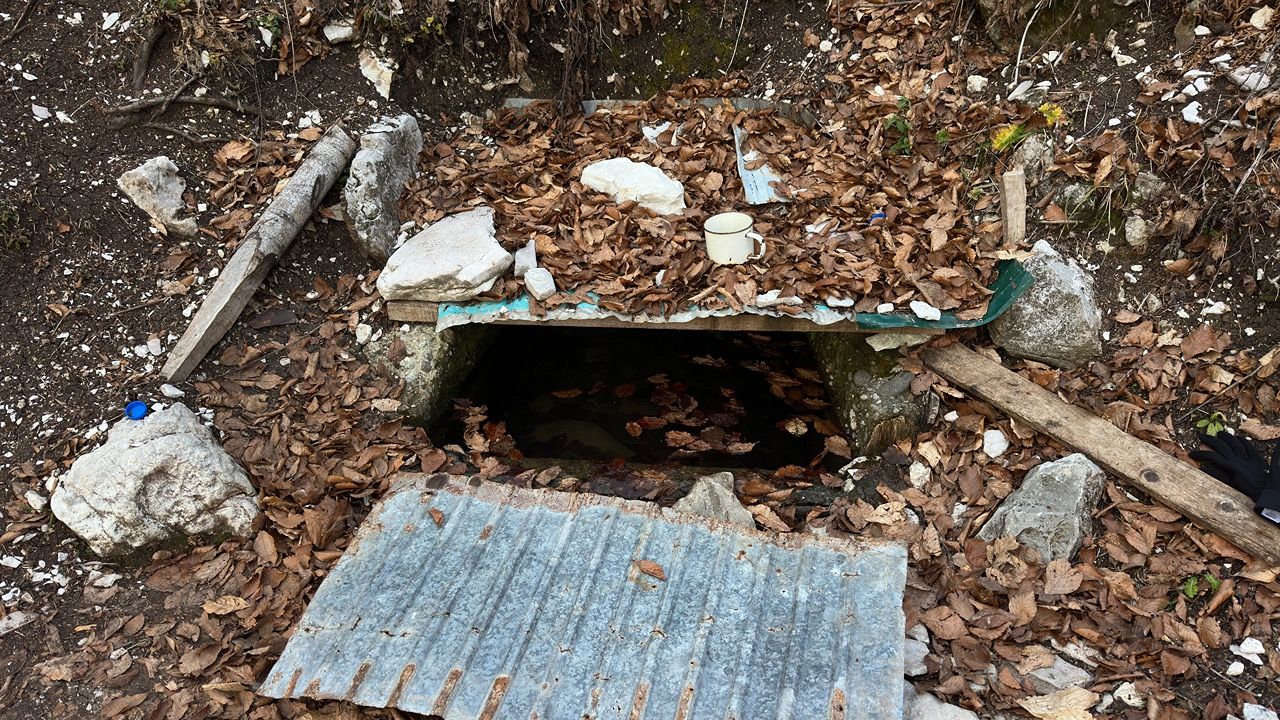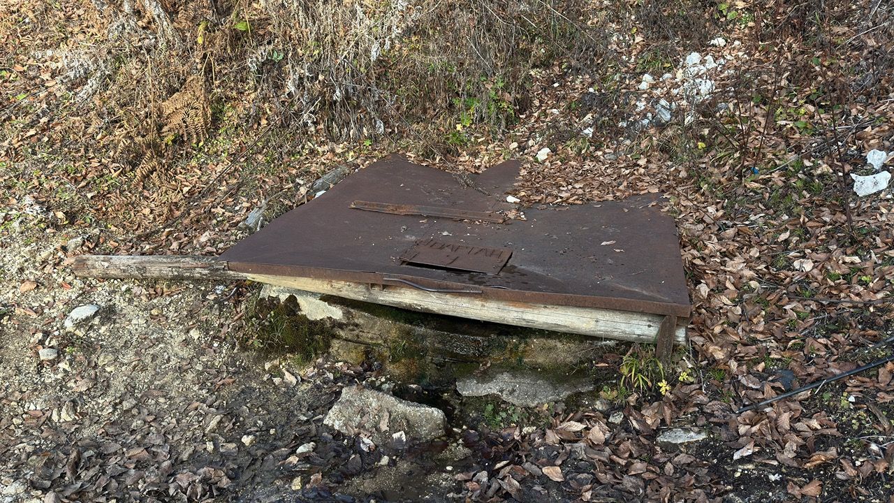 Родник закрыт железным листом от листьев. Внутри вода хорошая, нужна кружка.